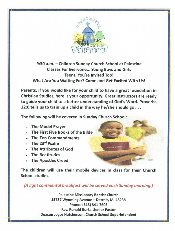 The following will be covered in Sunday Church School: The Model Prayer, The First Five Books of the Bible, The Ten Commandments, The 23rd Psalm, The Attributes of God, The Beatitudes and The Apostles Creed.
